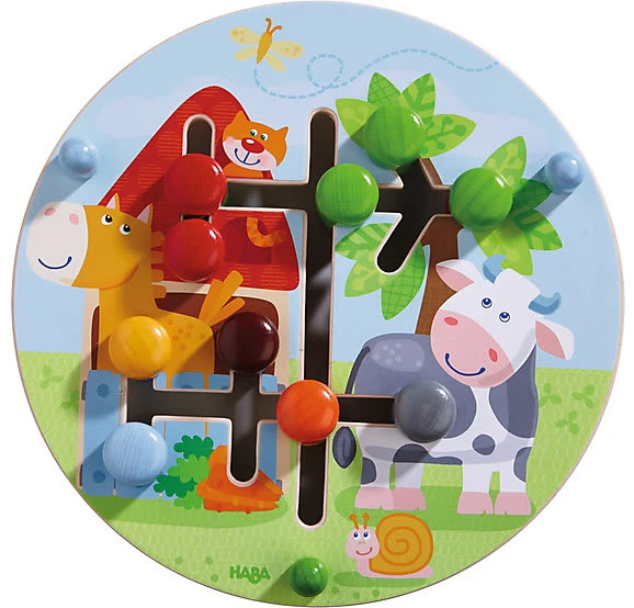 Schwarz und weiß ist die Kuh, rot das Dach und grün der Baum – das weiß doch jedes Kind! Und mit diesem lustigen Schiebebrett lernen sie schon früh, diese Farben zuzuordnen. Dreht man das Schiebebrett um, lernen sie spielend geometrische Formen kennen.