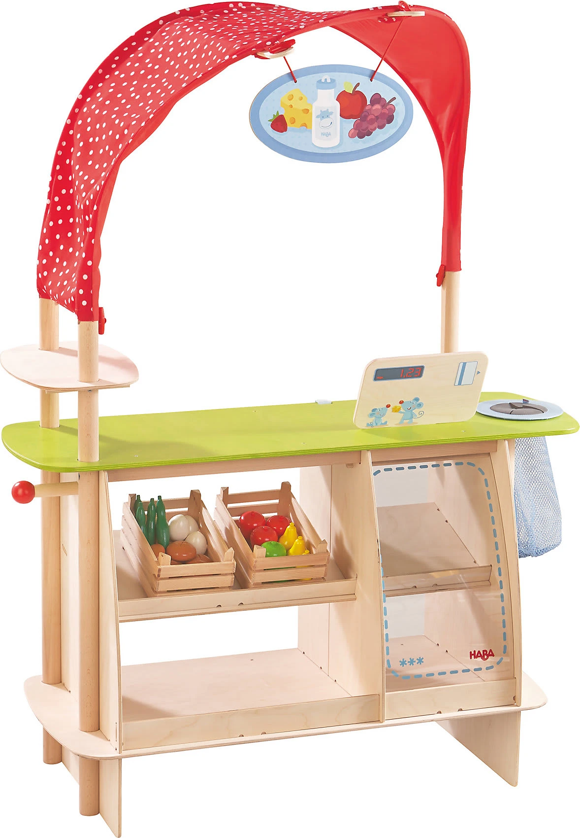 Guten Tag! Was darf´s denn sein? Etwas Süßes oder lieber etwas Herzhaftes? Und wie wäre es mit frischem Obst und knackigem Gemüse? Der HABA-Kaufladen Einkaufsglück mit integrierter Frischetheke hat für seine kleinen Kunden all das zu bieten, denn die Auslagen können ganz nach Lust und Laune mit unterschiedlichsten Kaufladen-Artikeln bestückt werden.