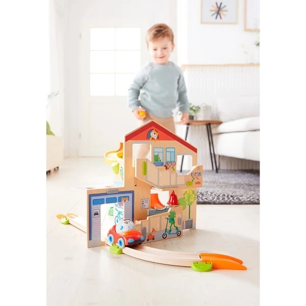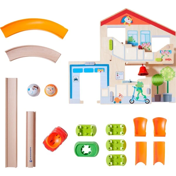 Diese tolle Kugelbahn besteht aus einer niedlichen Hauskulisse mit vielen lustigen Spielfunktionen: Die Kugeln rollen die Rampe herunter und durchqueren dabei verschiedene Hausbereiche, die vorne und hinten betrachtet werden können. Verlässt eine Kugel das Haus, klingelt ein Glöckchen – nur noch kurz die Rampe herunter, wo das Kugelcabrio bereit steht! Die Bahn ist robust verarbeitet und mit bunten Motiven bedruckt. Art.-Nr.: 1913062