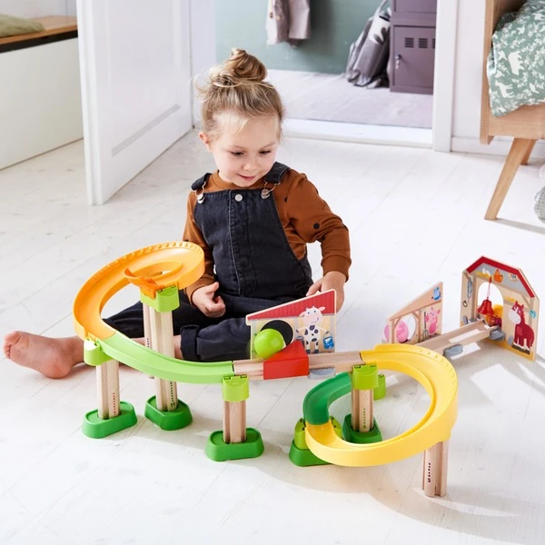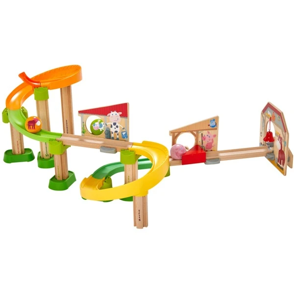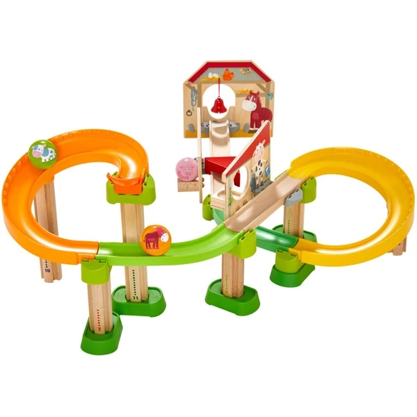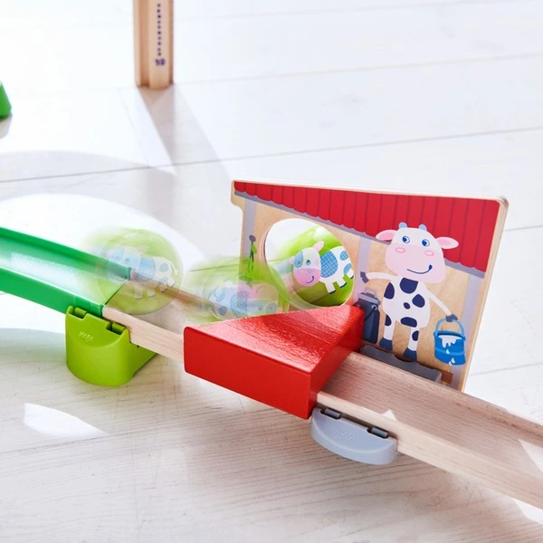 | Inhalt/Ausstattung | 3 Kulissen Tierstall, 1 Kugel Kalb Karl, 1 Kugel Fohlen Frida, 1 Kugel Ferkel Svea, 2 Spiralkurven, 2 Stufenkurven, 11 Verbindungselemente, 1 Startrampe, 2 Kulissenklemmen, 2 Geraden, 6 Säulen, 1 Umlenkstein rot | ||