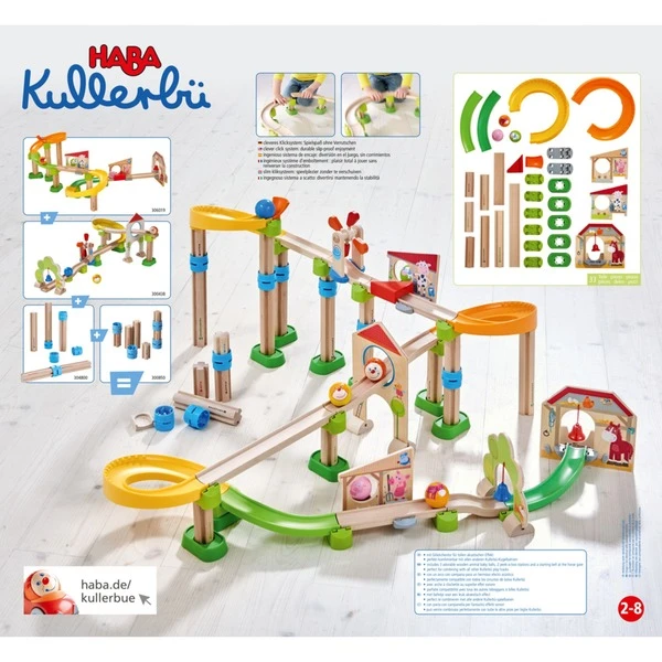 Viel Kullerspaß mit den lustigen Tierkindern: Fohlen Frida, Kalb Karl und Ferkel Svea sausen die Kugelbahn hinunter und durch zwei rasante Kurven. Am Ende der Bahn wartet der gemütliche Stall mit Glöckchentor. Dieses Kugelbahn-Set aus der Serie Kullerbü ist leicht aufgebaut und erfreut mit tollen Kulissen und lustigen Dekorationen. Art.-Nr.: 1731345