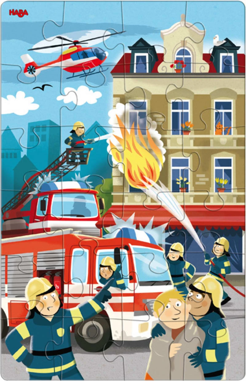 Mit den Puzzles Im Einsatz von HABA sind Kinder ab 4 Jahren dabei, wenn die Polizei einen flinken Räuber verfolgt und die Feuerwehr einen Brand löscht. Die Puzzle-Box enthält zwei klassische Puzzles mit je 24 Teilen aus stabiler Pappe. Viele tolle Fahrzeuge, mutige Einsatzkräfte und jede Menge Details gibt es zu entdecken. Die lebensnah gestalteten Szenen regen zum Erzählen an. Beim Zuordnen der Puzzleteile helfen viele Einzelheiten auf den Bildern. Die farbenfrohen Kinder-Puzzles sind ein tolles Training für Konzentration und Feinmotorik mit riesen Lege-Spaß. Spielend lernen mit HABA.