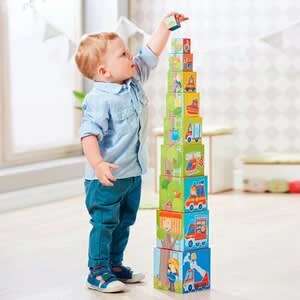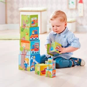 Die Stapelwürfel von HABA bieten kleinen Baumeistern mit bunten Feuerwehrmotiven lehrreichen Spielspaß. 10 Stapelwürfel von HABA bunte Feuerwehr- und Baummotive auf- und ineinander stapelbar ab 12 Monaten aus stabilem Karton Je höher gestapelt wird, umso mehr Details gibt es zu entdecken. Die zehn Würfel bestehen aus Karton und sind mit bunten, aufeinander abgestimmten Bildern bedruckt. So lässt sich ein Baum bauen oder der Einsatz der Feuerwehr verfolgen. Dabei trainieren die Minis ihre Feinmotorik und lernen, Motive zu unterscheiden und zuzuordnen. Auch die Zahlen von 1 bis 10 können anhand der Stapelwürfel spielerisch erlernt werden.
