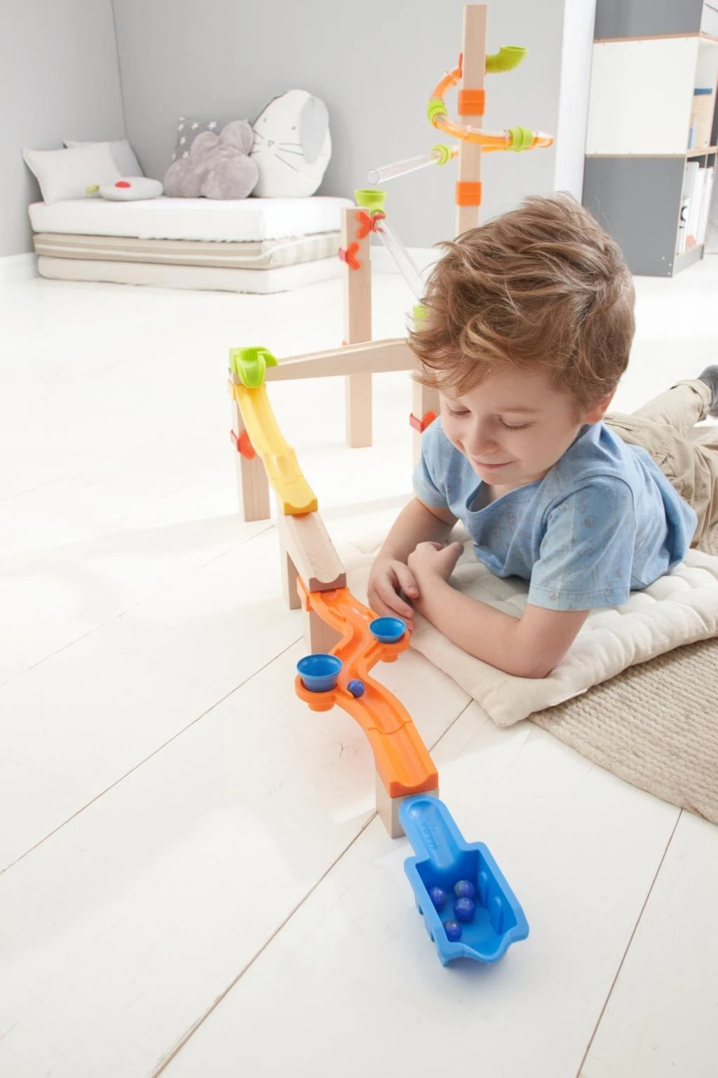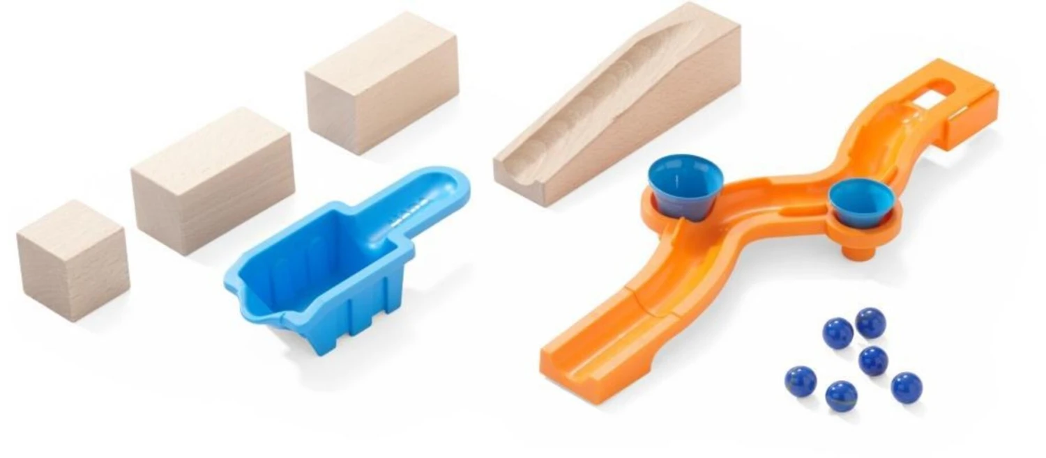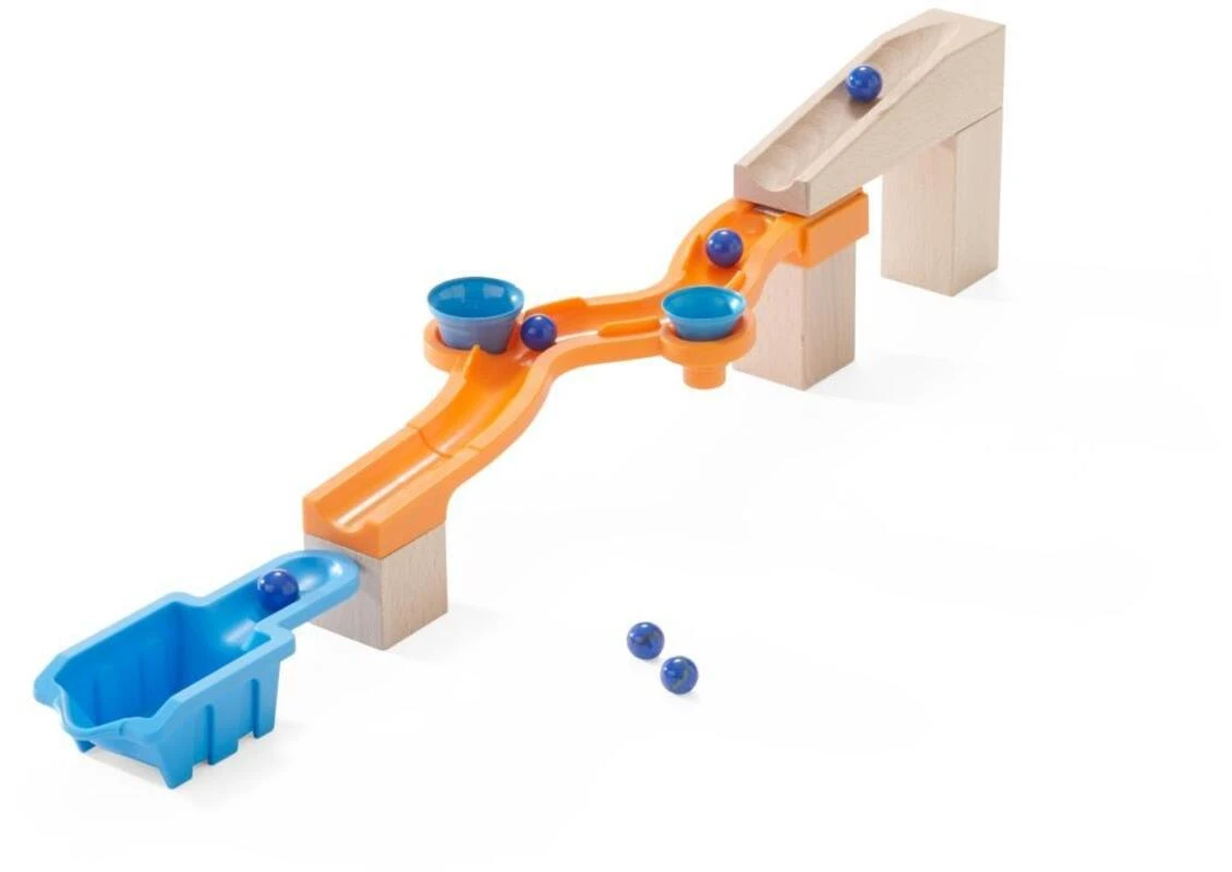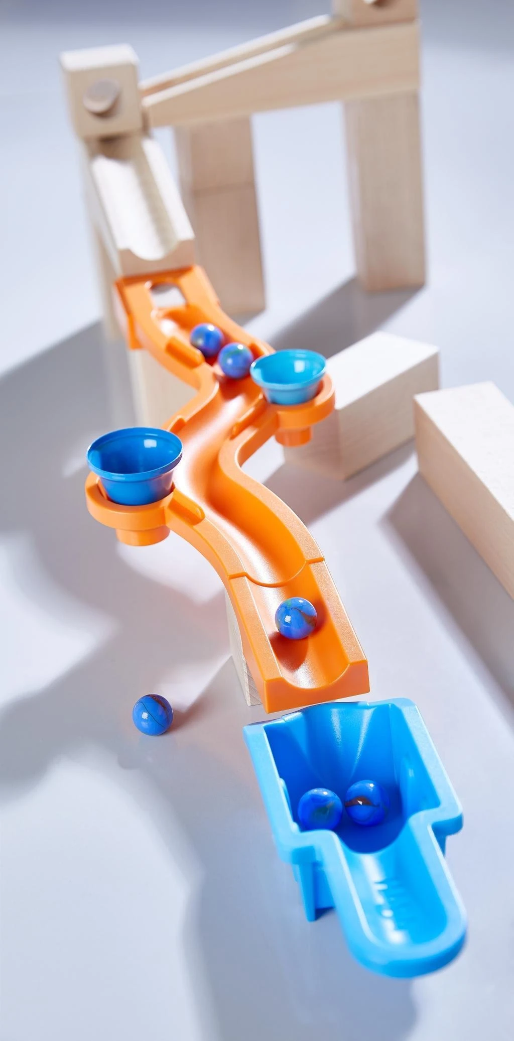 Hier trifft Kugelbahn-Bauspaß auf coole Sounds: Die Murmeln kullern mit Schwung die Soundeffekt-Bahn hinunter und bringen erst die eine und dann die andere Sound-Glocke zum Klingen. Im praktischen Auffangbehälter, dem Marble-Container, ist Endstation – zumindest vorerst. Denn wenn der Container am Start der Kugelbahn entleert wird, beginnt das Kullervergnügen von vorne.