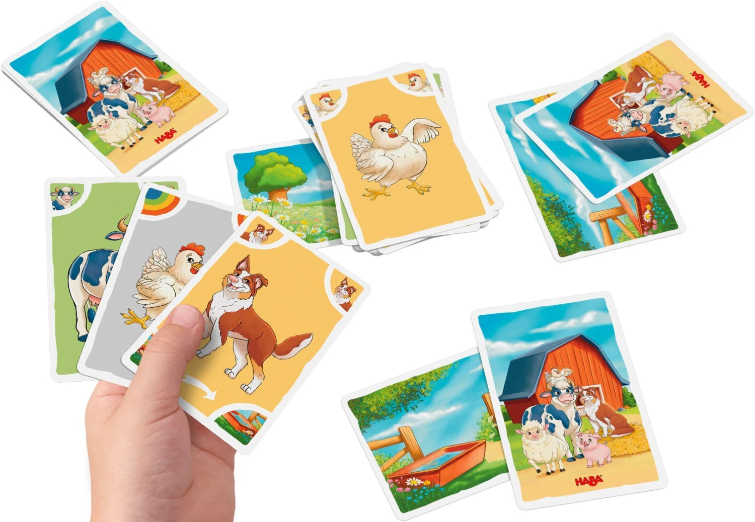 Jetzt geht’s aufs Land! Mit HABAs Mau Mau – Bauernhof haben kleine Kartenspieler alle Hände voll zu tun: Bei diesem farbenfrohen Kinderspiel gilt es, gezogene Karten mit der passenden Tierart oder Farbe auf der Blumenwiese abzulegen. Wer am Ende die wenigsten Karten hat, gewinn das Mau Mau. Mit höchstens drei Karten auf der Hand spielen schon Kleinkinder gerne mit. Beim Zuordnen der Karten üben die Kinder genaues Schauen und bei der Verständigung über mögliche Züge üben sie ihre Ausdrucksfähigkeit und Kommunikation. Spielend lernen mit HABA.